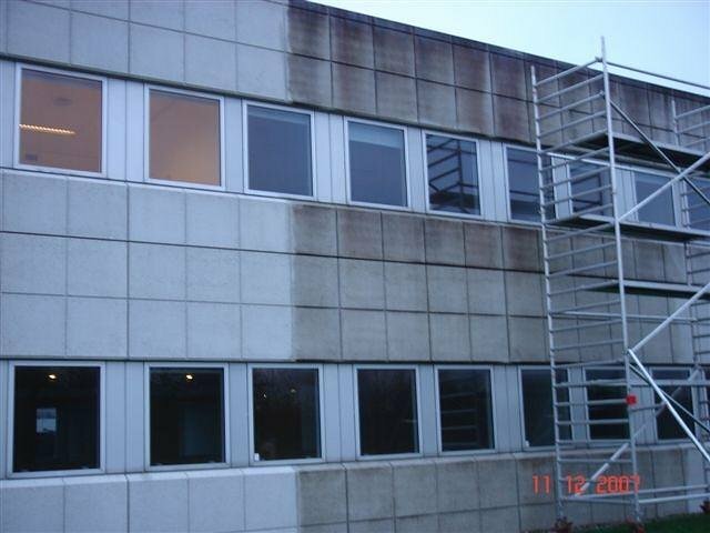 Vi tilbyder afrensning af facader og andre bygningsdele, som ikke er beskadiget på anden måde end tidens omskiftelige vejr i form af alger, pollen, bilos og almindelig smuds.